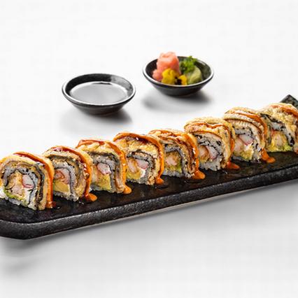Crispy prawn tempura, avocado, crabstick, and cream cheese rolled in sushi rice and nori, topped with crispy unagi, spicy mayo, tare sauce, and sesame seeds.